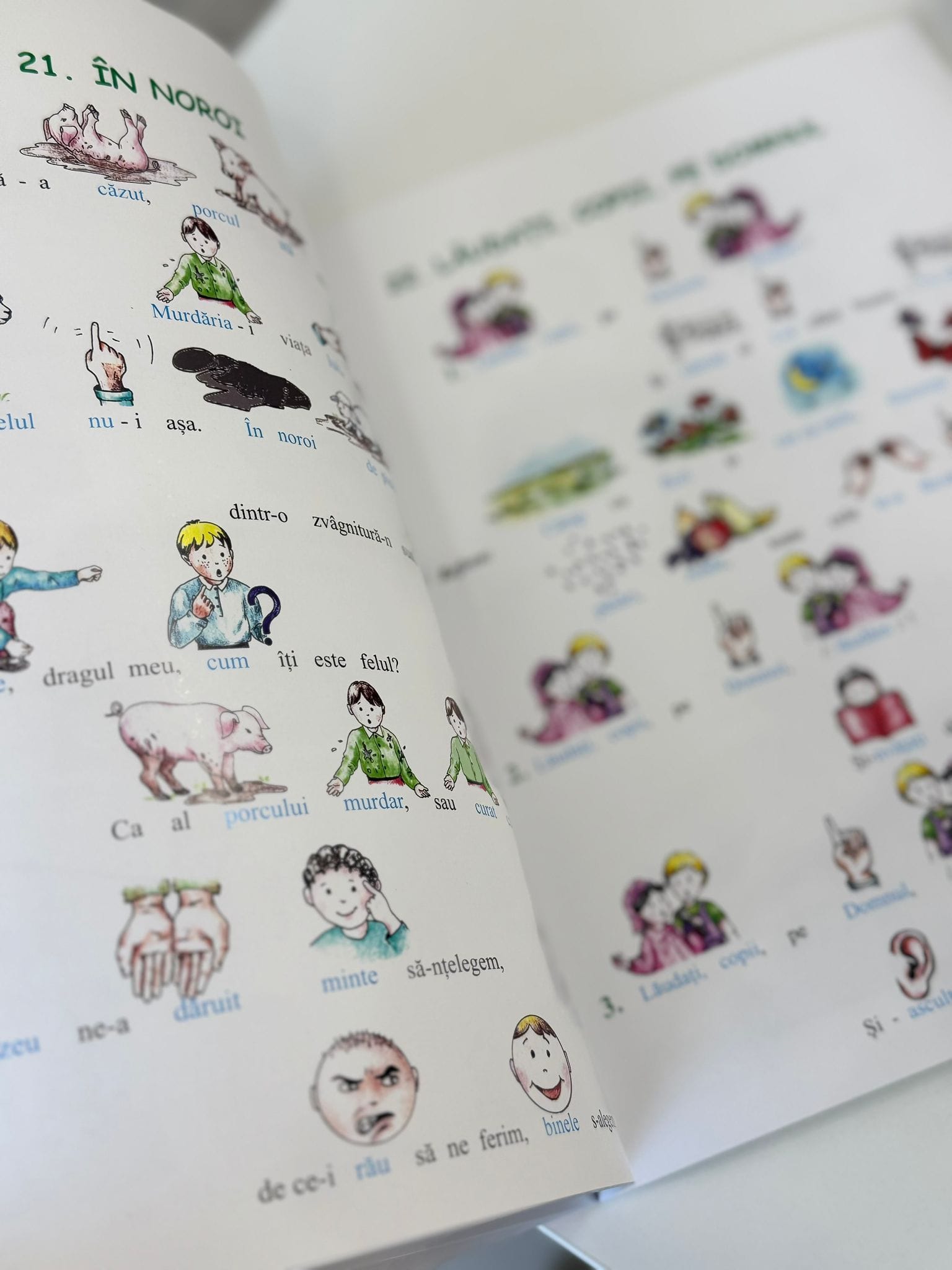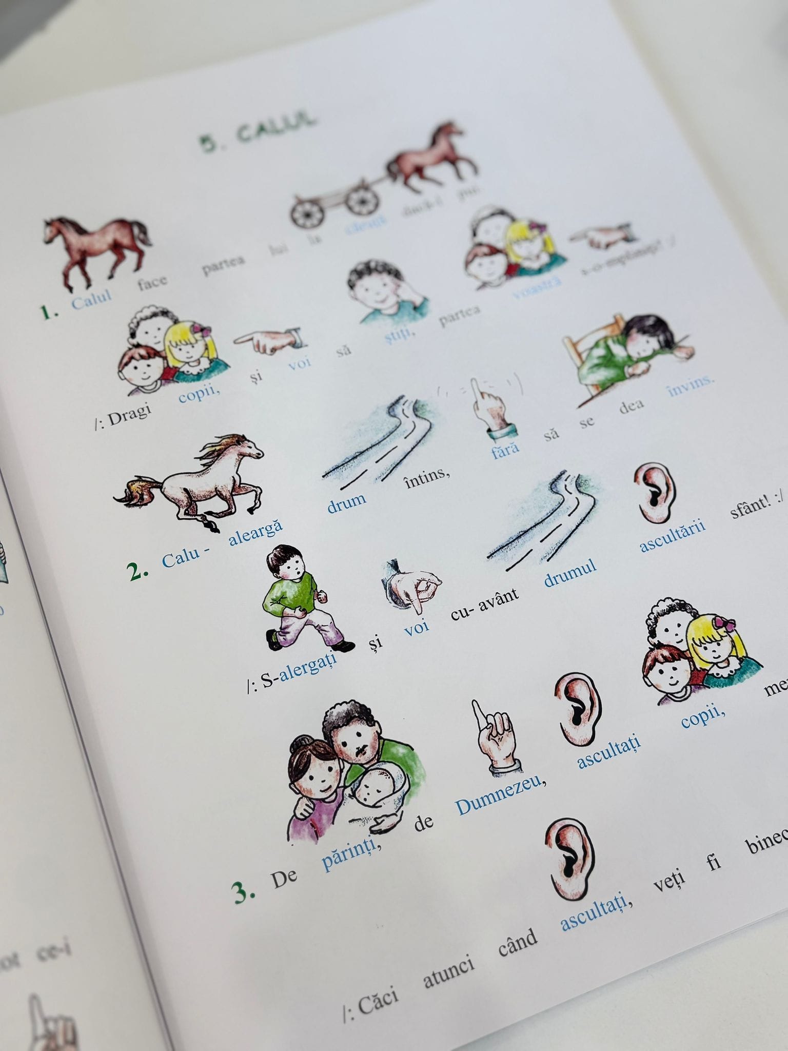 Cuvintele sunt simbolizate prin desene ca versurile să poată fi descifrate cu ușurință de ochișorii micuților.