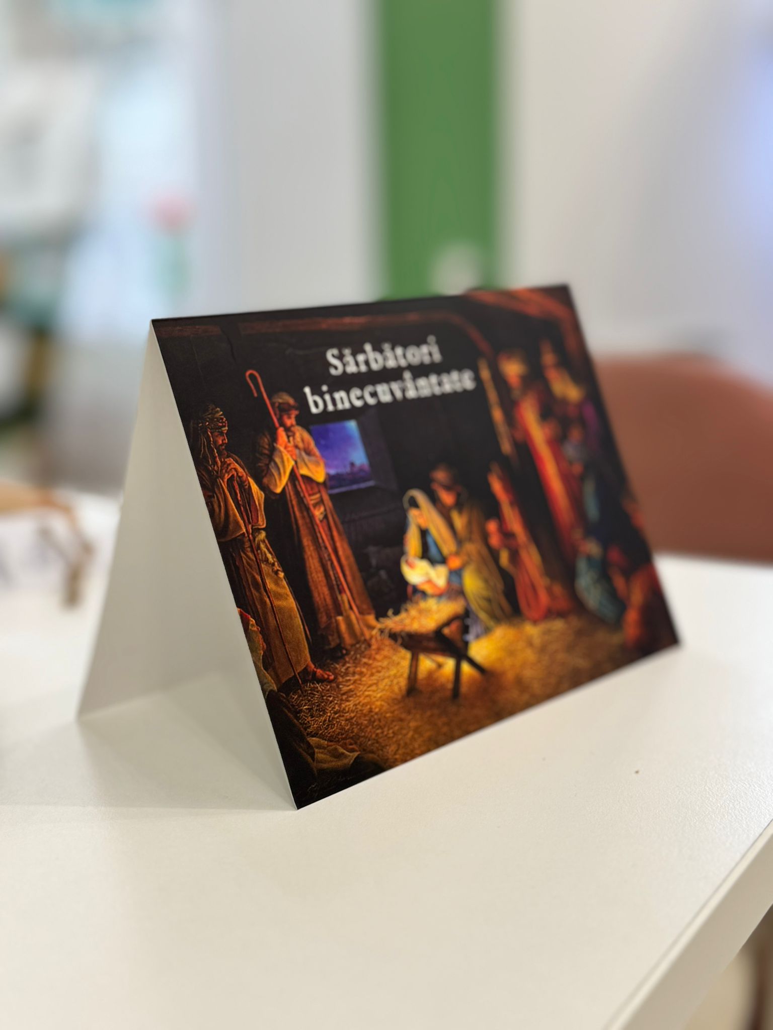 O felicitare elegantă și profund creștină, perfectă pentru a transmite urări pline de har în sezonul Nașterii Domnului. Designul ei prezintă o scenă caldă a Betleemului, cu Pruncul Isus, Maria, Iosif, păstorii și magii — o imagine care aduce aminte de adevărata bucurie a Crăciunului.