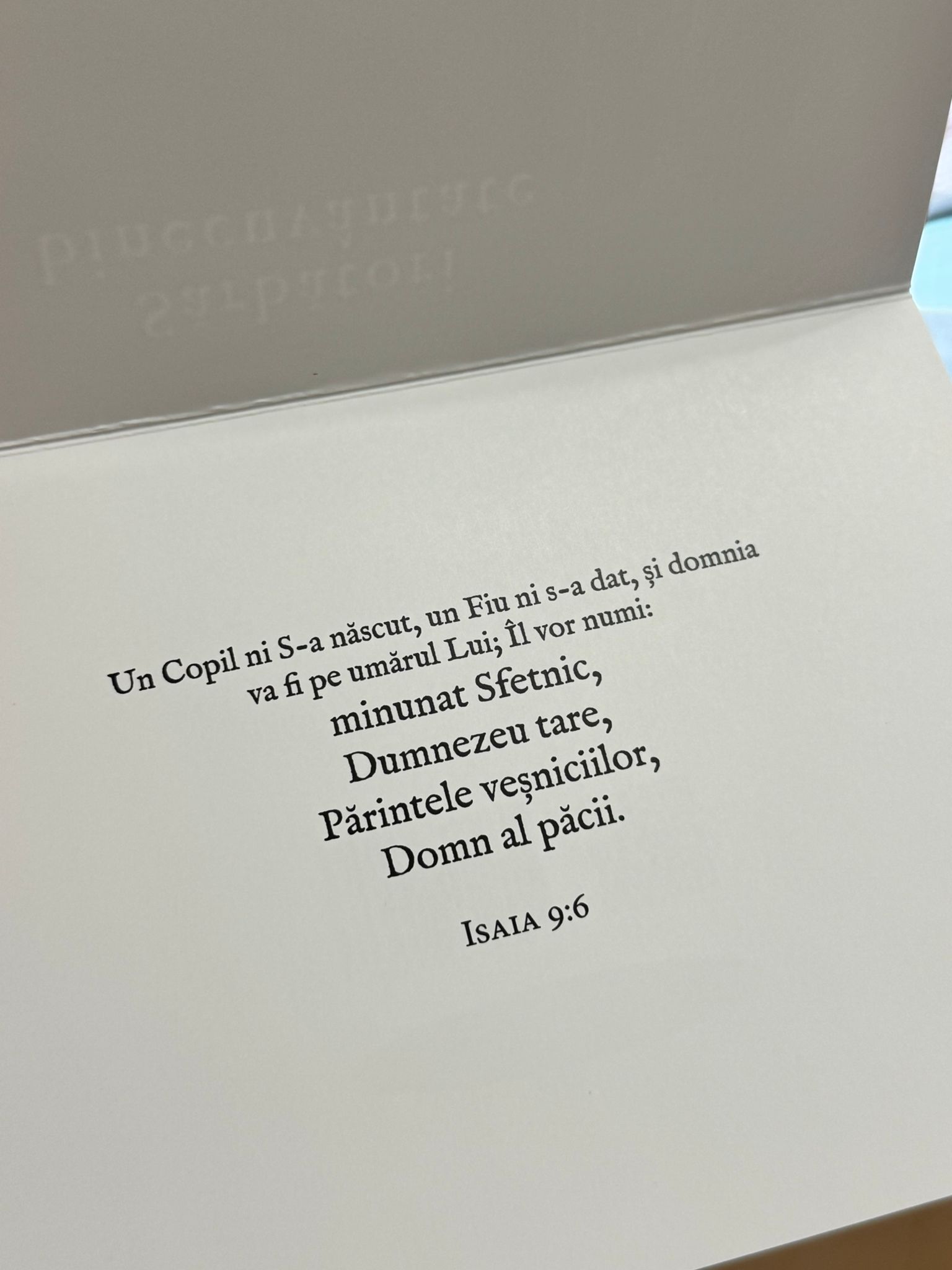 În interior, felicitarea conține versetul biblic din Isaia 9:6, tipărit impecabil:
