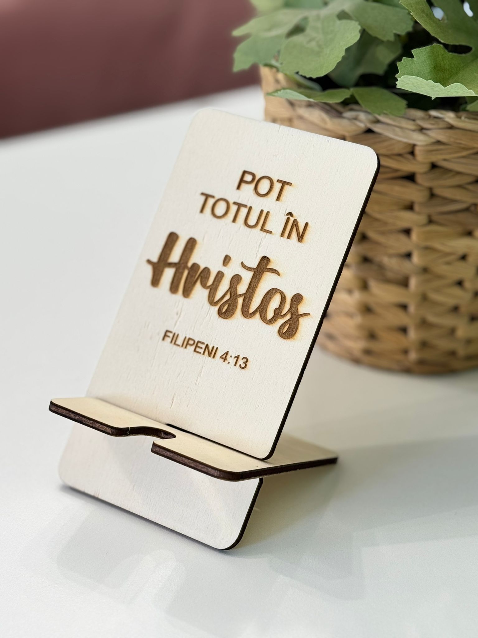 Suport de telefon din lemn – Pot totul în Hristos